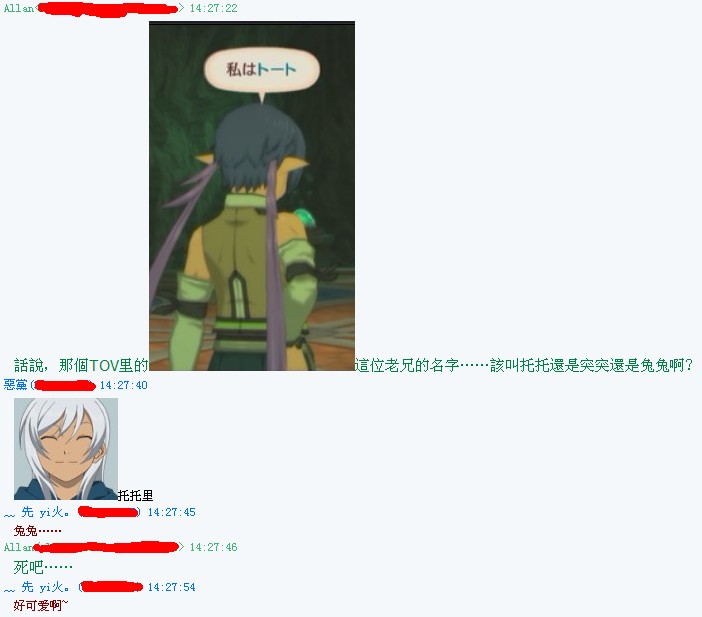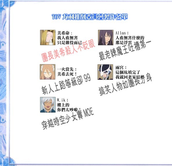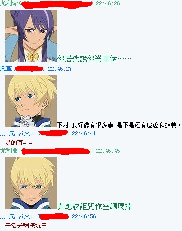 最近一直是在弄TOV流程的翻譯,只能說……好累人……看著很爽可是一做起來就覺得爲什麽內容那麼多!!不愧是臺本掂著都有幾斤重的量,小說都有四本